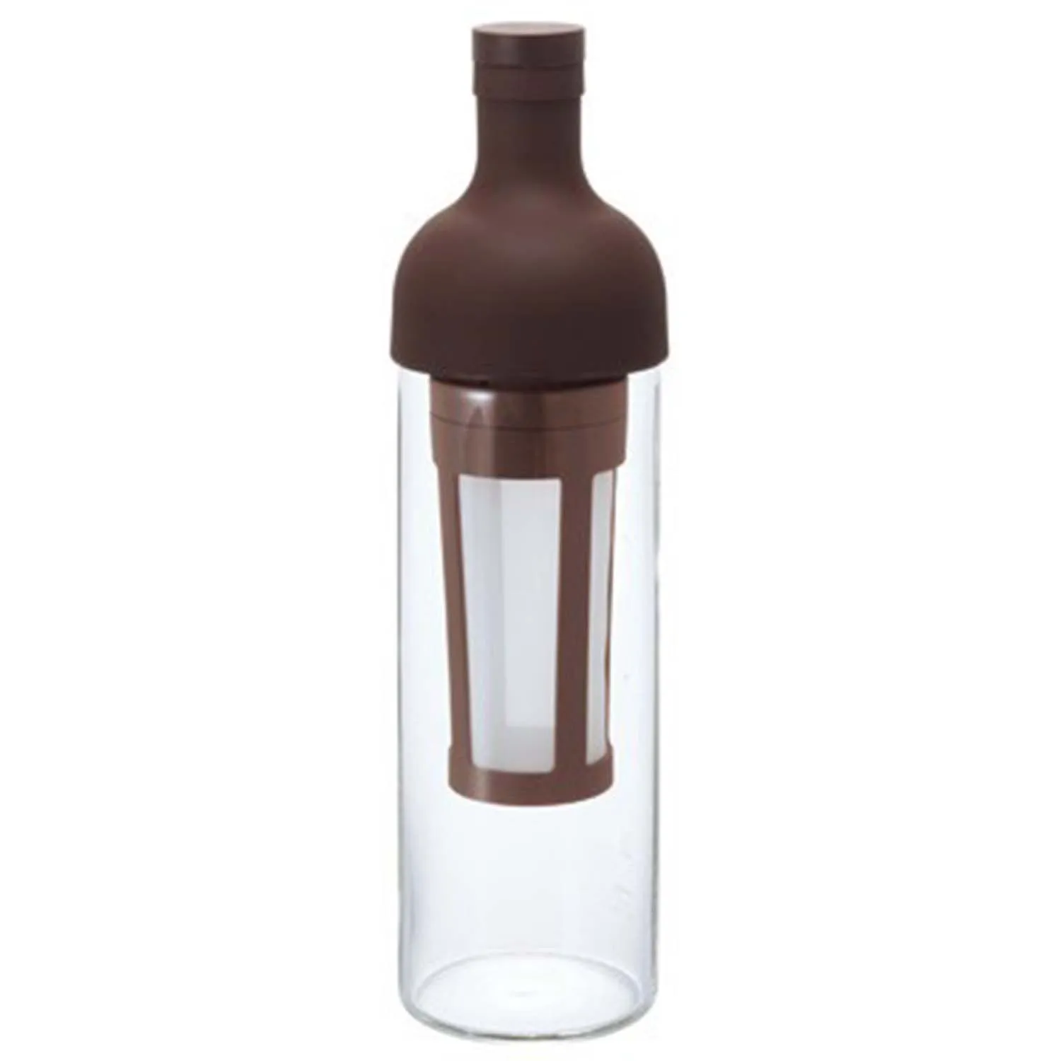 コーヒー粉と水だけでアイスコーヒーがつくれます。ストレーナーにコーヒー粉を入れ、フタをして注口にセットしたら少量ずつ水を注ぎます。水を注ぎ終えたら栓をして、ボトルをゆっくり左右に振って抽出を促します。 冷蔵庫で約8時間抽出して出来上がりです。