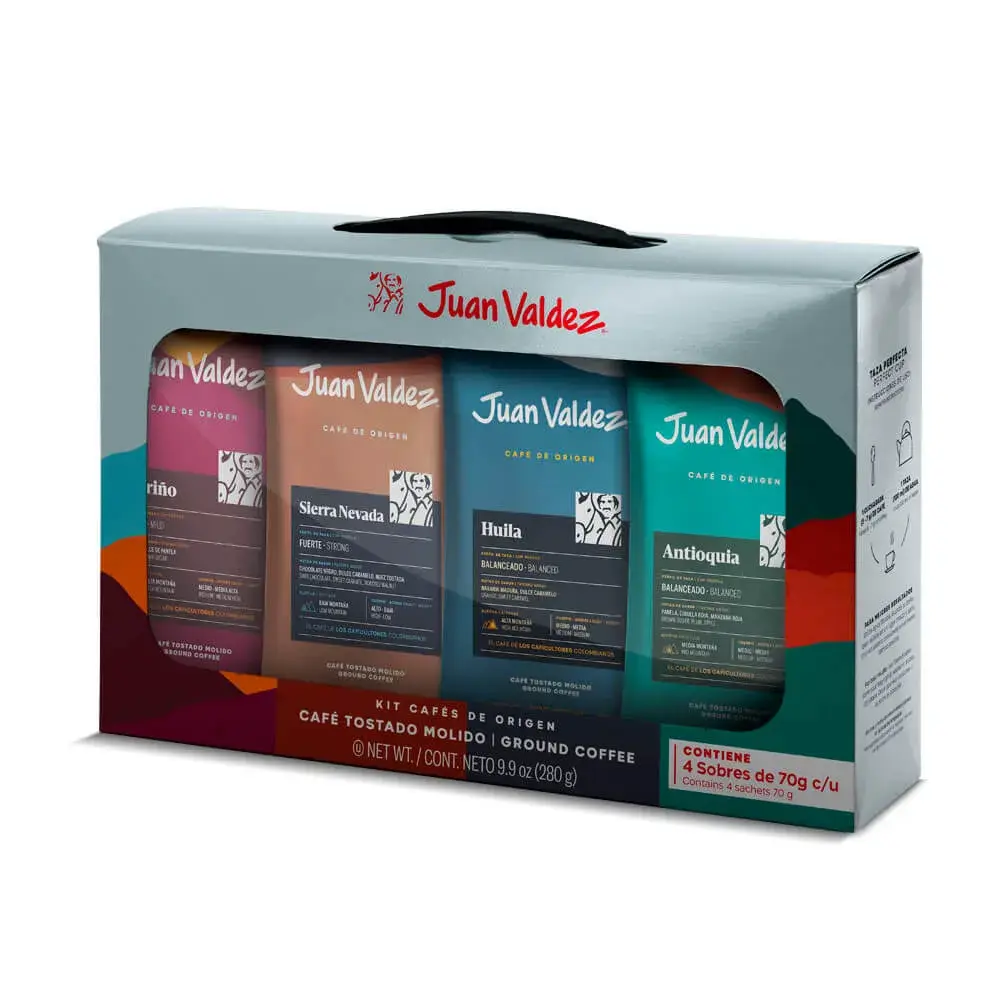 コロンビアの四大コーヒー産地の特色を楽しめるセットです。シエラネバダ、ウィラ、アンティオキア、ナリーニョから選ばれた各70gの挽き豆が一つに。